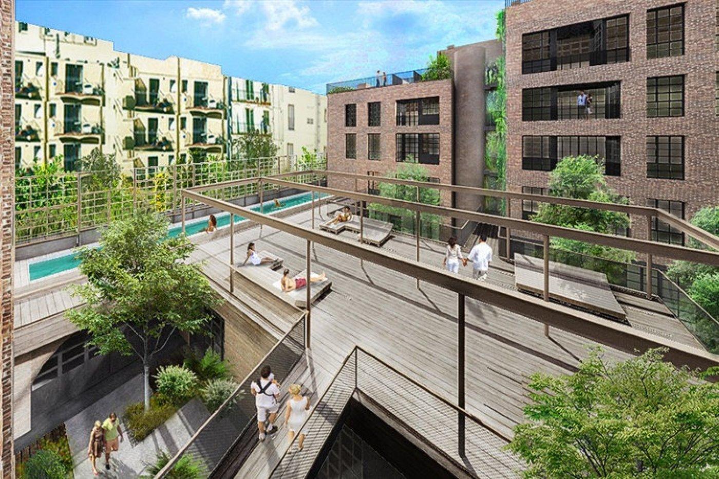 L’immeuble se distingue par ses caractéristiques écologiques : jardins verticaux, huertos urbains, système de climatisation par aérothermie, service de conciergerie, vidéosurveillance 24h/24, recyclage des eaux pluviales, et un parking pour vélos. Au cœur du complexe, un atrium lumineux rempli de lucarnes et d’arbres offre un espace de vie unique.